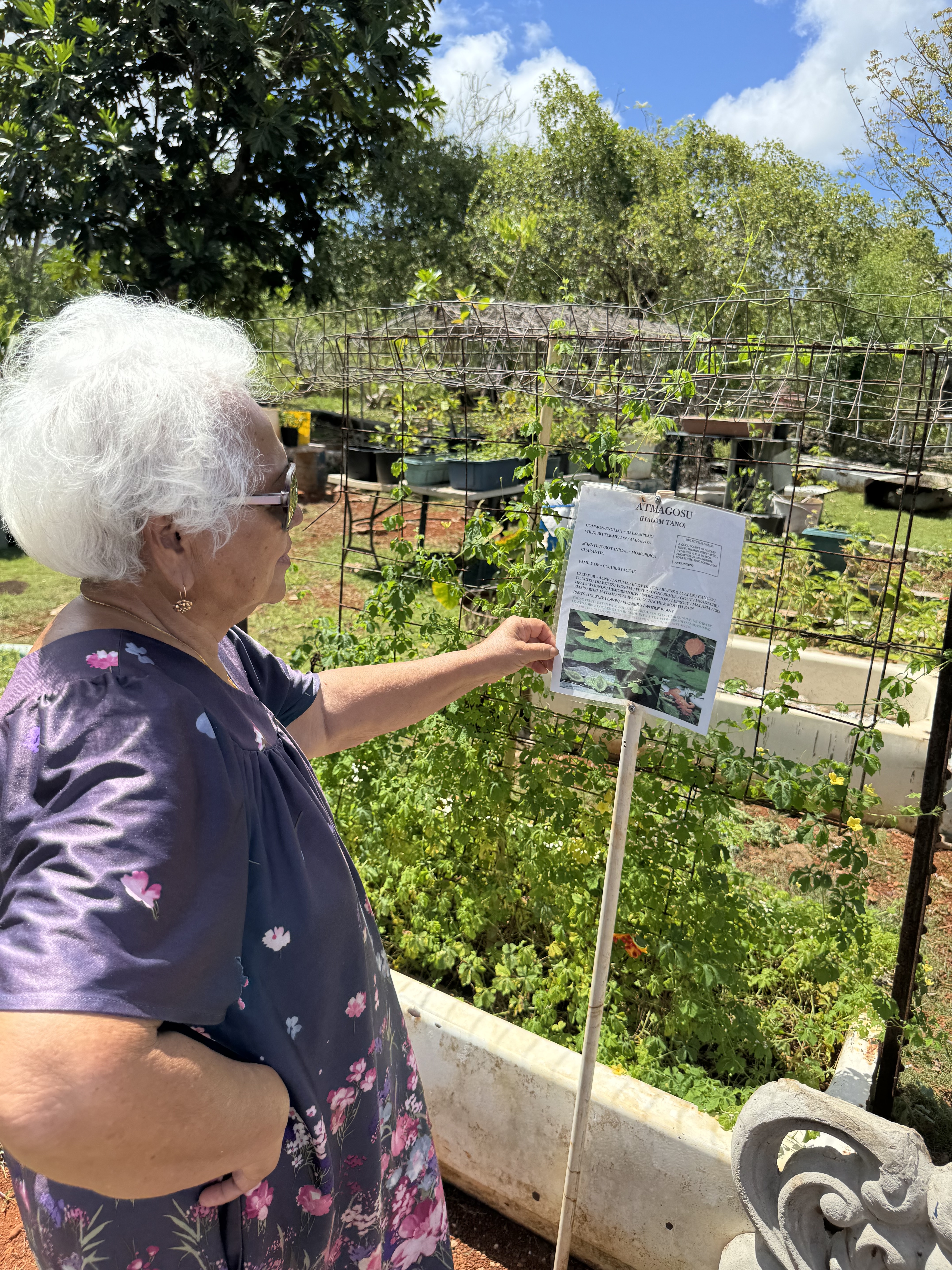 Surahana Bernice Nelson has been a practitioner of naturopathic medicine since the 1960s, using natural remedies to support the body’s inherent ability to heal itself. She currently leases a three-acre farm named “Åmot TaoTaoTano.” Today, her business partner, Susan Marie Taitano Aguon, joined her in managing the farm. Susan is also from a long lineage of healers—the Sutiano family—and has been practicing naturopathy since childhood. Both women are natives of Saipan and relocated to Guam in the early 1990s.